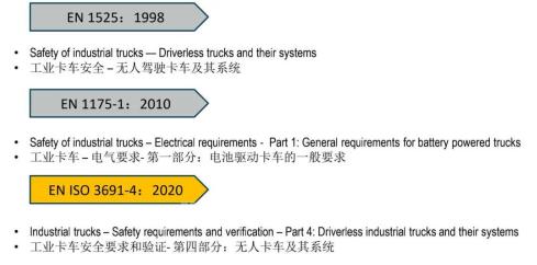 EN1525是最早的一部可供参考的AGV安全防护标准,标准中的一些要求描述比较“笼统”,比如:使得小车安全防护到位且整个电气回路达到安全标准,AGV的生产厂家对于标准的理解不同,就会导致各家的安全要求参差不齐。而且EN1525评估的指标是基于EN954-1标准的Category,而这个标准早已被EN ISO 13849-1代替,因此EN1525已经不太适用了。