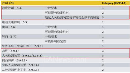 2020年发布的适用于AGV的新标准EN ISO 3691-4对安全要求进行了更新,新标准中不仅新增了额外的功能要求,还在评估维度上做了更详细的场景分类并且有具体的量化要求。在安全等级(PL等级)的要求上,则采用EN ISO 13849-1来处理控制系统的安全相关部分(SRP/CS)。