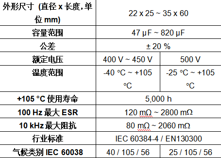 作为非固态电解质极性铝电解电容器,该器件适合用于开关电源、电机驱动、太阳能逆变器、工业冷气机、焊接设备的平滑、缓冲和DC-Link滤波。