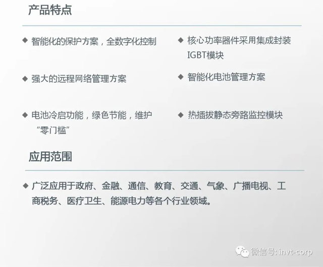 本次应用的英威腾RM系列模块化UPS电源是全数字化电源产品,集中了电力电子与自动控制领域的技术成果。