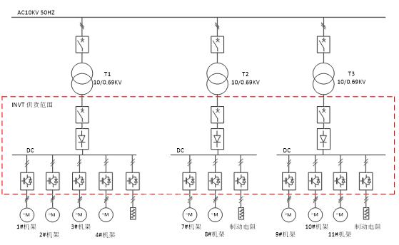 传动系统采用整流单元+公共直流母线段+逆变单元形式组成的多传动系统。主轧机采用英威腾GD800系列做为核心主驱,配合基础自动化级完成全线速度级联控制,轧制微张力控制等核心功能。