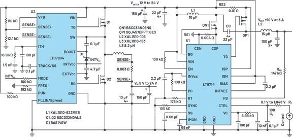 整个2级转换器的输入电压范围为5 V至24 V,涵盖汽车电子的冷启动压降和工业应用中的掉电情况。启用转换器时,基于控制器U2的升压转换器(级1)使中间总线电压保持在或高于12 V。升压转换器的动力系统包含电感L3、MOSFET Q1和Q2。2级结构支 持下游的4象限转换器正常工作,在所有工作条件下向负载提供±10 V电压。