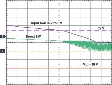 图 2.VIN从 14 V 降低至 5 V 时的波形。VIN = 5 V/div ,VOUT = 5 V/div ,升压 SW = 10 V/div ,时标为 200 µs/div 。