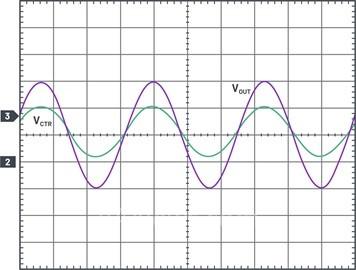 图 3. 与正弦控制信号呈函数关系的正弦波输出波形。 VCTRL= 0.5 V/div, VOUT = 5 V/div ,时标为 5 ms/div 。
