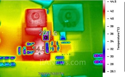 此工作模式已经过测试和验证。为此,将图1中电路的 VOUT 连接至实验室电源(设置为12.5 V),将VIN连接至电子负载,将流经转换器的电流设置为4.5 A。4象限转换器的热影像如图5所示。