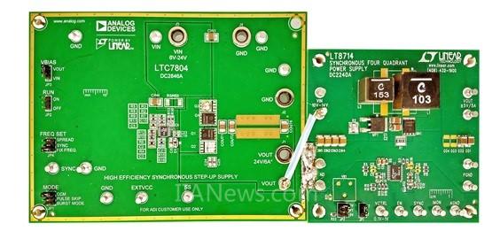 图6所示为转换器实物照片,它由两个焊接在一起的ADI演示电路组成:分别是DC2846A 升压转换器演示电路和DC2240A 4象限转换器演示电路。