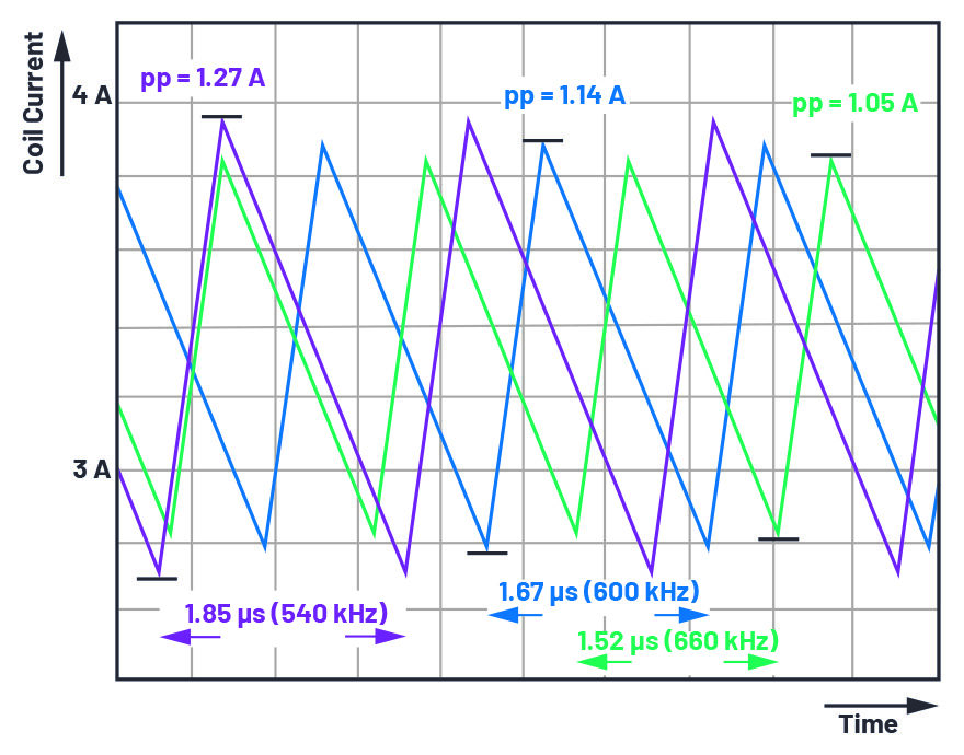图2.受开关频率变化影响的峰到峰线圈电流纹波