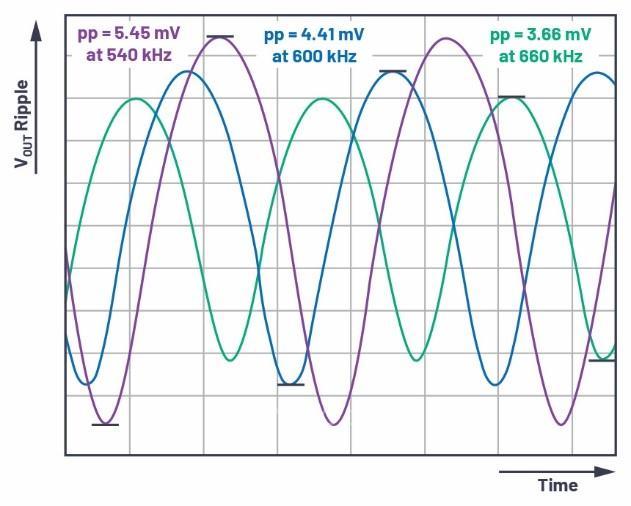 图3.在开关模式稳压器IC中,开关频率变化导致的输出电压纹波变化