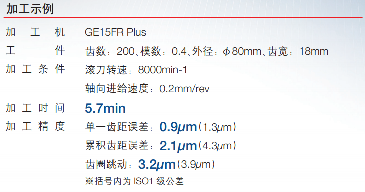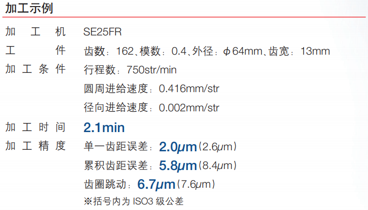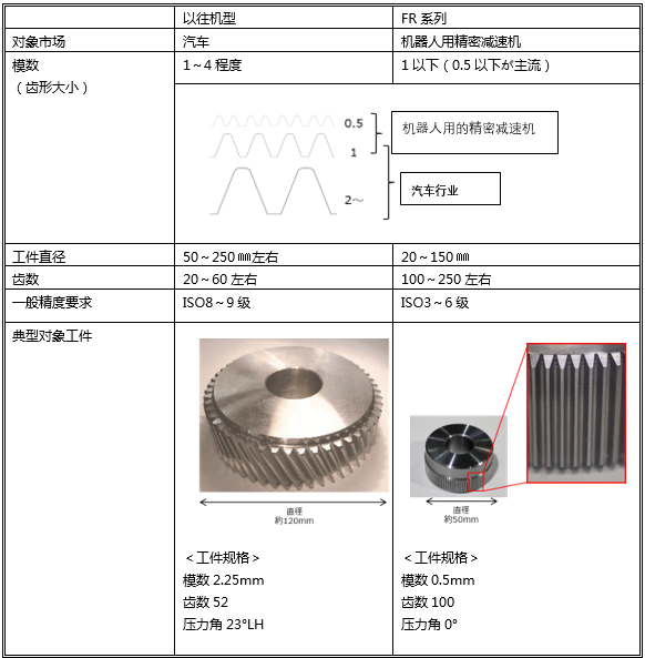 相对于以往汽车用齿轮模数1~4,精度要求ISO8~9级的量产型齿轮加工,此次推出的FR系列专注于机器人减速机所需的齿轮模数可达到1以下,高精度要求也可实现ISO3~6级的齿轮加工。
