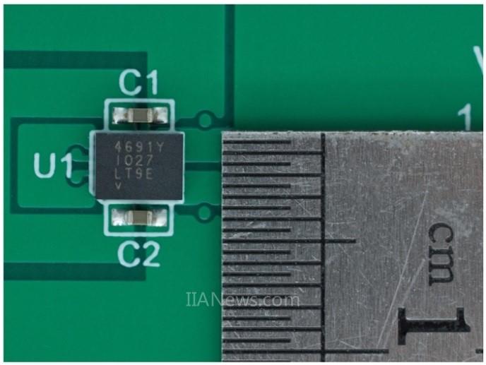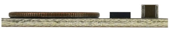 图1.LTM4691放在一枚硬币和1210大小的陶瓷电容旁,可以看到它外形纤薄