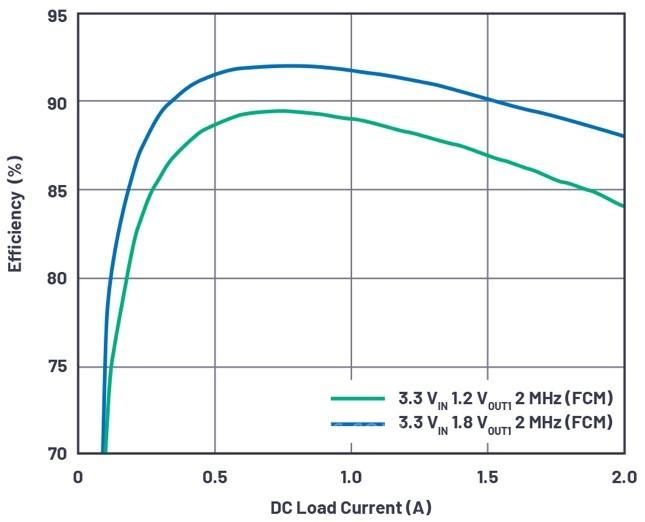 图5.LTM4691 VIN = 3.3 V、VOUT1 = 1.2 V、VOUT2 = 1.8 V和fSW = 2 MHz的效率曲线
