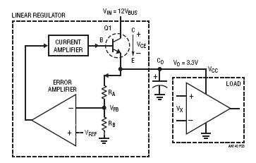 另一方面,如果VO接近VIN,则线性稳压器的效率很高。但是,线性稳压器(LR)还有一个限制,即VIN和VO之间的最小电压差。LR中的晶体管必须在线性模式下工作。因此,双极性晶体管的集电极到发射极或FET的漏极到源极之间需要一定程度的最小压降。如果VO太接近VIN,LR可能就无法调节输出电压。能够以低裕量(VIN – VO)工作的线性稳压器称为低压差稳压器(LDO)。