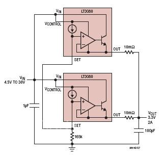 图7.并联两个LT3080线性稳压器以增加输出电流