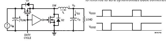 上述分析显示,续流二极管的功率损耗为3.62W,远高于MOSFET Q1和电感L的传导损耗。为进一步提高效率,ADI公司建议可将二极管D1替换为MOSFET Q2,如图9所示。该转换器称为同步降压转换器。Q2的栅极需要对Q1栅极进行信号互补,即Q2仅在Q1关断时导通。同步降压转换器的传导损耗为: