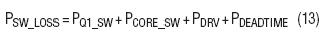 3. 其他交流相关损耗。其他交流相关损耗包括栅极驱动器损耗PSW_GATE(等于VDRV • QG • fS)和死区时间(顶部FET Q1和底部FET Q2均关断时)体二极管传导损耗(等于(ΔTON + ΔTOFF) • VD(Q2) • fS)。