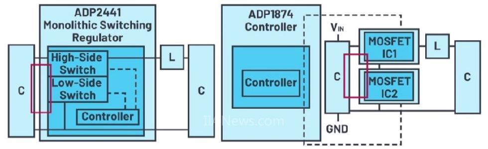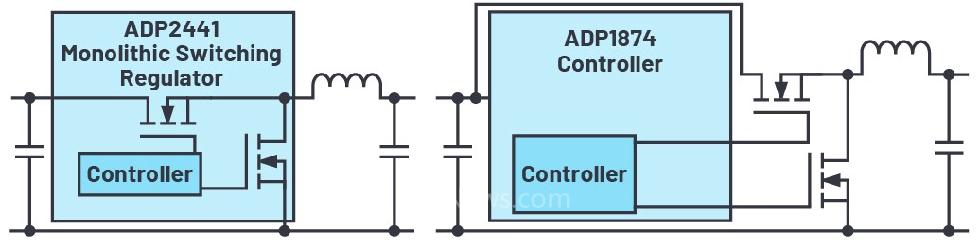 图1.单片式降压转换器(左);带外部开关的控制器解决方案(右)