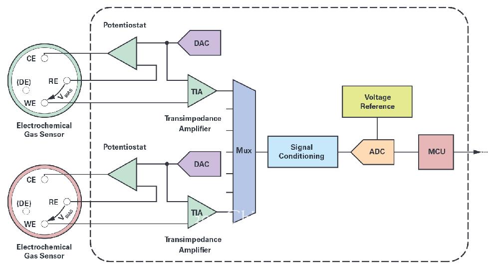 在全部气体检测应用中,电化学气体传感器的利用率都在增加,这给此类系统的物流、调试和维护带来了挑战,导致总拥有成本增加。因此,人们采用具有诊断功能的专用模拟前端来减少技术缺点(主要是传感器寿命有限)带来的影响,确保气体检测系统长期可持续且可靠。