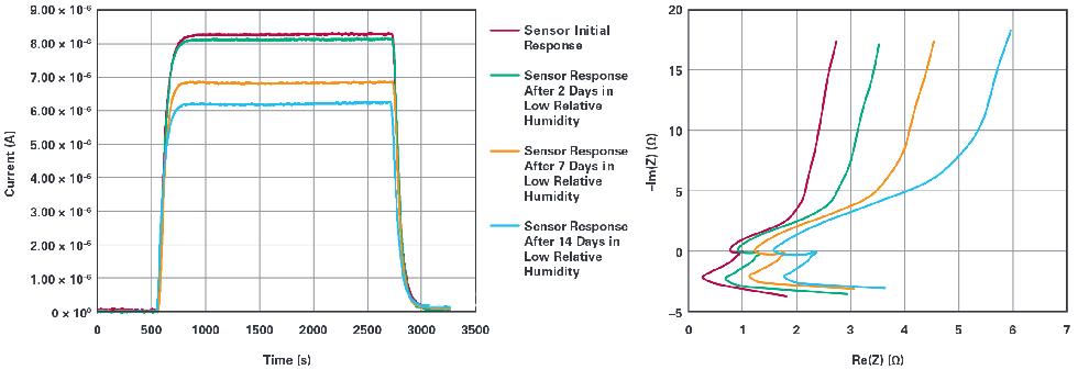 图3.在低相对湿度下的加速寿命测试中,传感器灵敏度(左图)和阻抗(右图)之间的相关性