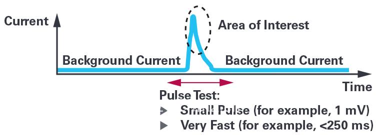 计时安培法(脉冲测试)是另一种有助于分析传感器健康状况的技术。测量方法如下:在传感器偏置电压上叠加一个电压脉冲,同时观测流经电化学电池的电流。脉冲幅度一般非常低(例如1 mV)且很短(例如200 ms),因此不会干扰传感器本身。这样便能相当频繁地执行测试,同时气体检测仪器保持正常运行。在执行更耗时的EIS测量之前,可以使用计时安培法来检查传感器是否已物理插入设备中,还能指示传感器性能的变化。传感器对电压脉冲响应的示例如图4所示。