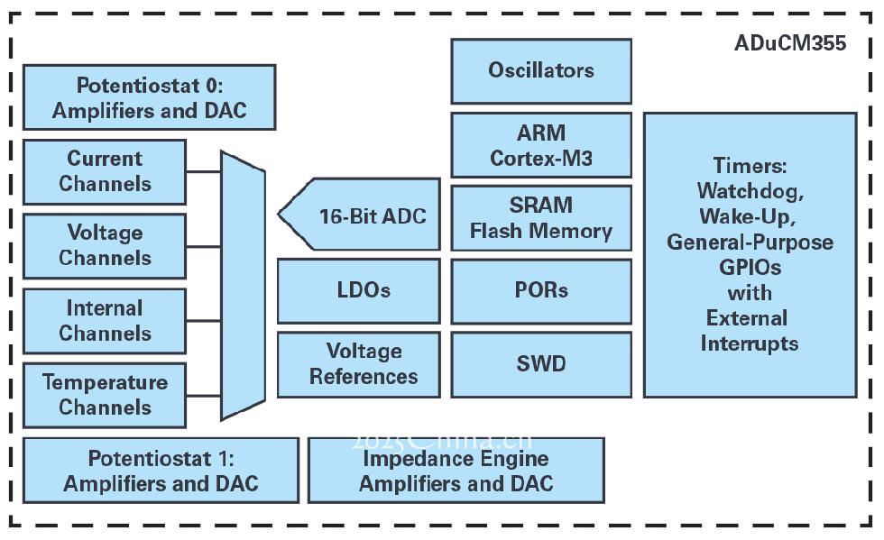 ADuCM355集成了两个电化学测量通道,一个用于传感器诊断的阻抗测量引擎,以及一个用于运行用户应用程序和传感器诊断补偿算法的超低功耗混合信号ARM® Cortex®-M3微控制器。图5显示了ADuCM355的简化功能框图。