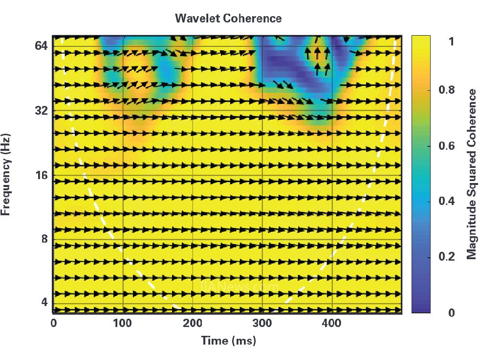 图4.两个接受比较的PPG信号的总体平均值之间的幅度方波相干性由时间域和频率域中的颜色强度图表示。箭头方向与信号之间的相位差成正比。方向向右的水平信号表示信号之间不存在相位差。1