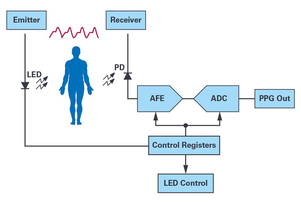 光电容积脉搏波(PPG)是测量血氧饱和度(SPO2)水平的常用技术。使用光发射器向人体发射光,然后使用光接收器测量反射或未吸收的光的数量。根据两段波长的比值,可以测量氧合血红蛋白的数量。类似技术也被用于测量心率(结合光学技术)或心率变异性。