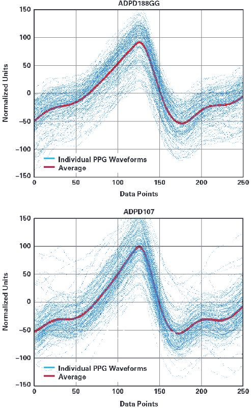 图3.提取单独的PPG波形(局部极大值周围的±125数据点),并彼此重叠比较(蓝色点线)。波形的总体平均值用红线表示。上图显示了由ADPD188GG和ADPD107分立式解决方案记录的PPG信号之间的相似性。