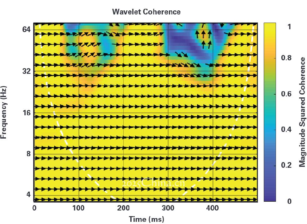 图4.两个接受比较的PPG信号的总体平均值之间的幅度方波相干性由时间域和频率域中的颜色强度图表示。箭头方向与信号之间的相位差成正比。方向向右的水平信号表示信号之间不存在相位差。1