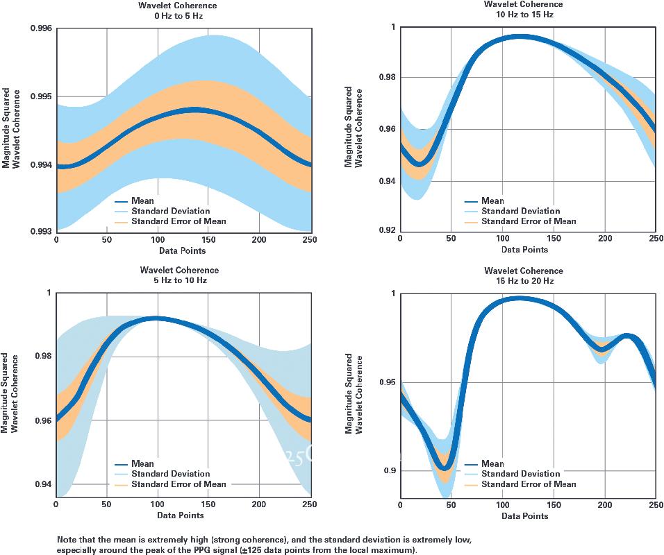 计算子波相干性和相关比较,以比较最主要频率范围内两个信号之间的稳定性。图3显示,两种PPG系统在单个波形及其平均值上的结果模式几乎相同。