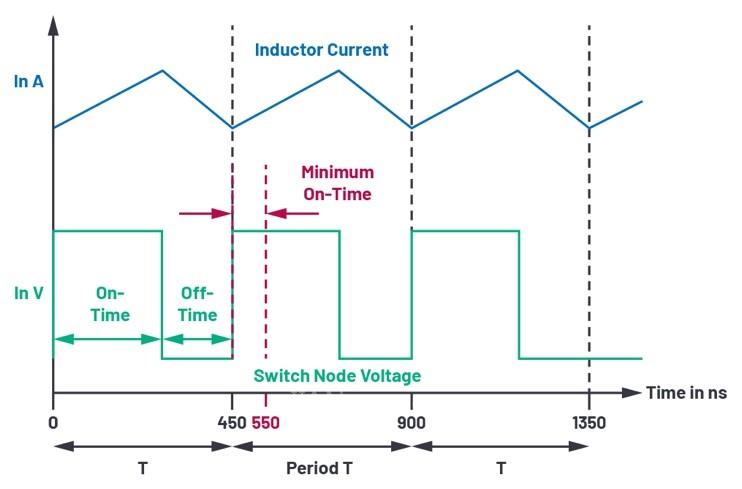 对于低占空比,例如降压型开关稳压器中的高输入电压和低输出电压,最小导通时间是关键限制。它通常会限制支持开关模式电源工作的最大开关频率。