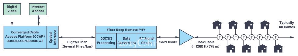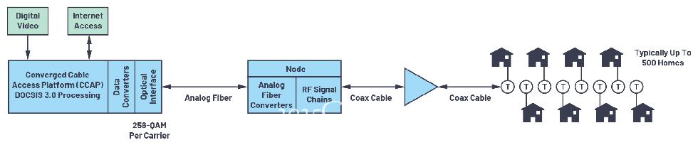 针对用户需要更快互联网连接的趋势,有线电视行业已开发新的网络架构,以便为用户提供数Gb服务。该光纤深入方法采用远程PHY设备(RPD),通过使用数字光纤将关键硬件移到更靠近用户的位置。这可与无线(蜂窝)网络中的远程射频头相媲美,可节约空间,减少前端散热,但也为远程设备带来了新的设计挑战。虽然有线电视信号绝对频率较低,但其带宽比无线信号宽得多,从108 MHz到1218 MHz扩展了几个倍频程,并具有多个带内谐波。RPD让设计人员面临诸多挑战,包括RF和混合信号硬件必须涵盖更宽的频率范围,具有更高的RF功率、更低的底噪和更好的线性度,同时消耗更少的直流功耗。每个下行末级RF放大器的功率通常为18 W,对于4端口系统,这大约是通常能够提供给RPD(由RPD消耗)的140 W至160 W功率预算的50%。