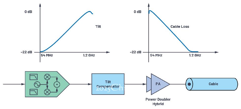 为了支持采用DOCSIS 3.1的更高阶QAM方案,节点输出端对MER的苛刻要求已从43 dB增加到48 dB。2在这样高的MER要求下,DAC时钟上的相位噪声和杂散信号会对系统性能产生影响。功率倍增器直接影响MER和带内带外失真的主要不利因素是非线性失真,包含谐波和交调失真。在108 MHz至1218 MHz的倍频程工作范围内,存在多个带内奇偶次谐波,而在185个D3.0载波(或等效载波)下,会产生一组非常复杂的IM产物。倾斜也有显著的影响,因为较高频道中的功率比最低频道中的功率大100多倍,所以这里会产生显著的差频积。峰均功率比(PAPR)超过12 dB。