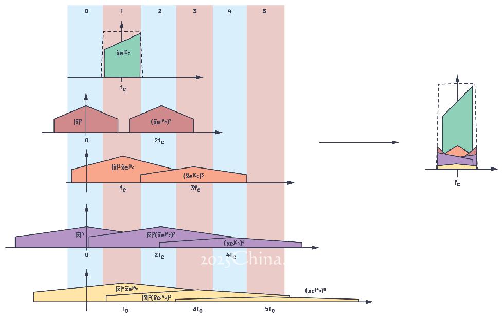 考虑到传统窄带数字预失真解决方案的处理在复杂的基带处完成,我们主要关注对称位于载波周围的谐波失真。在宽带电缆系统中,尽管保持了位于一次谐波周围的那些项的对称性,但是这一对称性不再适用于更高阶次的谐波产物。