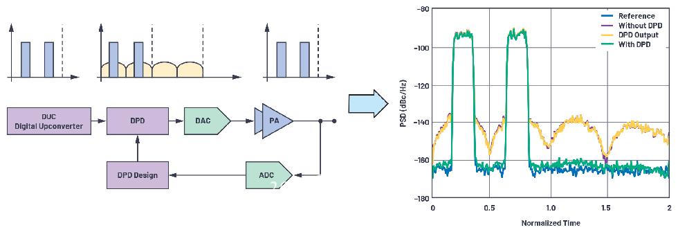 要兼顾效率和MER,具有吸引力的解决方案就是DPD,整个无线蜂窝行业几乎普遍采用。数字预失真(DPD)允许用户在更高效但非线性更明显的区域中运行混合功率倍增器,然后先预先校正数字域中的失真,再将数据发送到放大器。如图4所示,DPD在数据到达放大器之前对其进行整形,以抵消放大器产生的失真,从而扩大功率倍增器的线性范围。