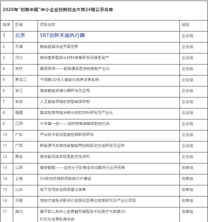 根据《2020年“创客中国”中小企业创新创业大赛24强产生办法(试行)》,在2020年“创客中国”中小企业创新创业大赛200强名单的基础上,经专家评审和现场公证形成大赛24强公示名单(排名不分先后)。