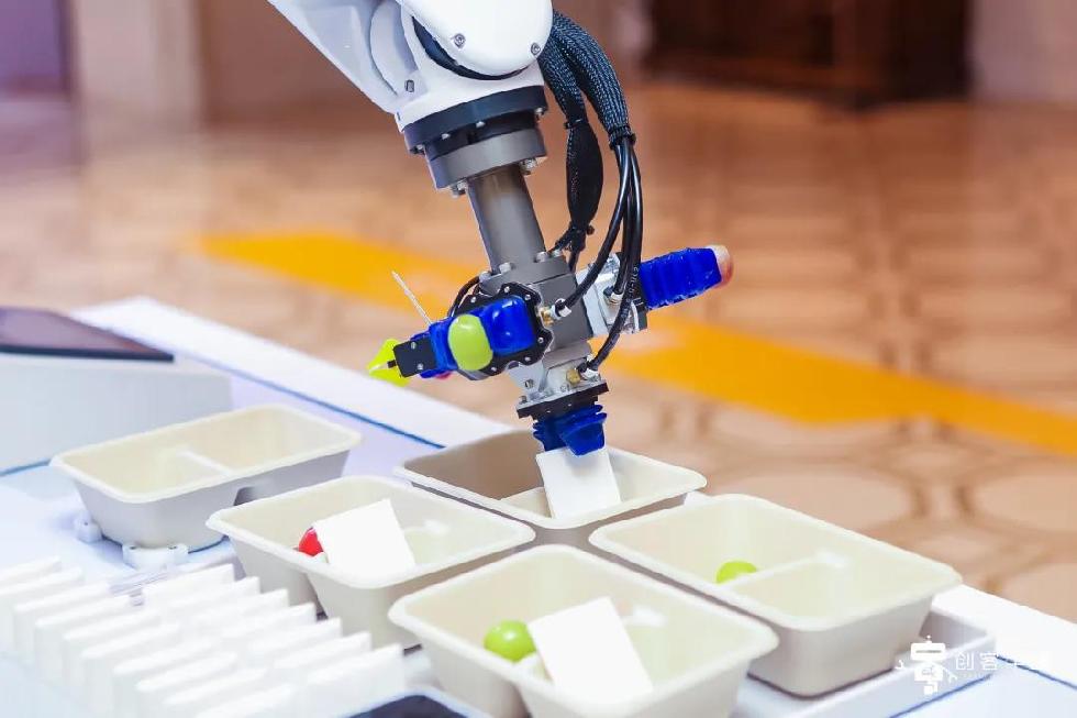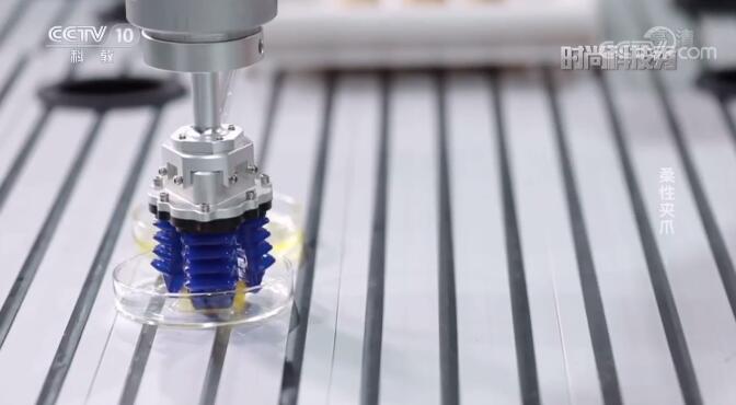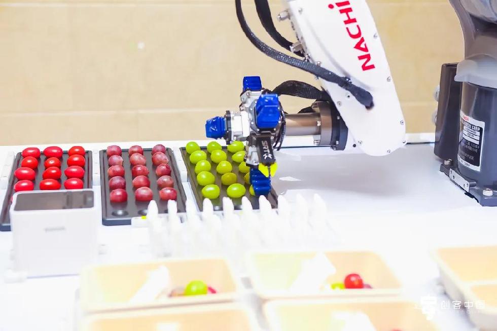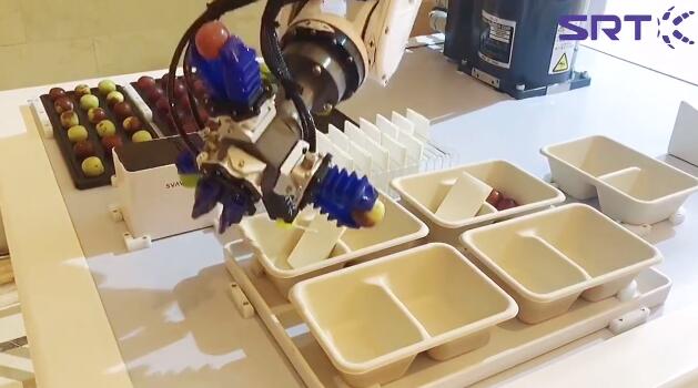 SRT软体机器人的“SFG系列柔性夹爪”协作机器人进配水果——通过软件控制单元分别抓取对应的物品,SFG系列柔性夹爪为食品级材质,已通过FDA\CE等国内外多项食品安全认证,它的抓取精准度更高,通用性更强,能将尺寸、形状不同的水果、纸巾、牙签放入果盘中。