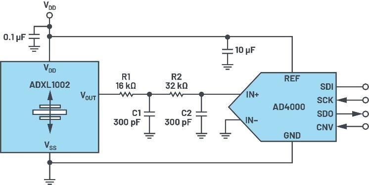 图1显示的是一个示例电路。来自ADXL1002的模拟输出信号通过2阶RC滤波器馈送至逐次逼近寄存器(SAR)模数转换器(ADC) AD4000,将模拟信号转化为数字值,以进一步处理信号。