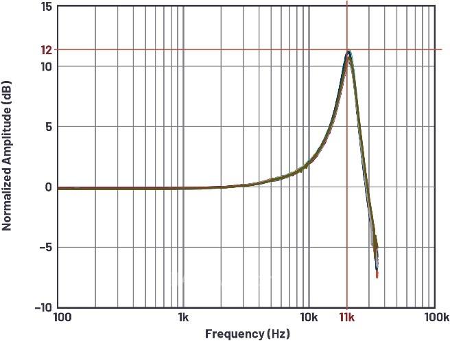 加速度计的频率响应是该系统最重要的特性,具体如图2所示。在频率高出约2 kHz至3 kHz时,增益增加。对于谐振频率(11 kHz),在输出电压下产生约12 dB(因子为4)的最大增益值。