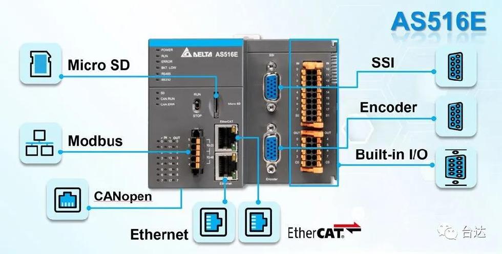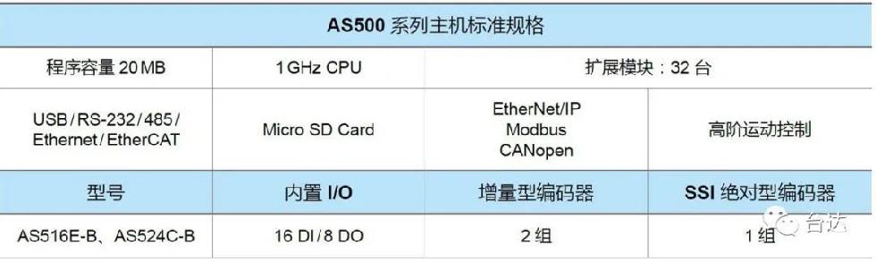另外,AS500系列也内置16路DI/8路DO、2路增量型编码器和1路SSI绝对型编码器。
