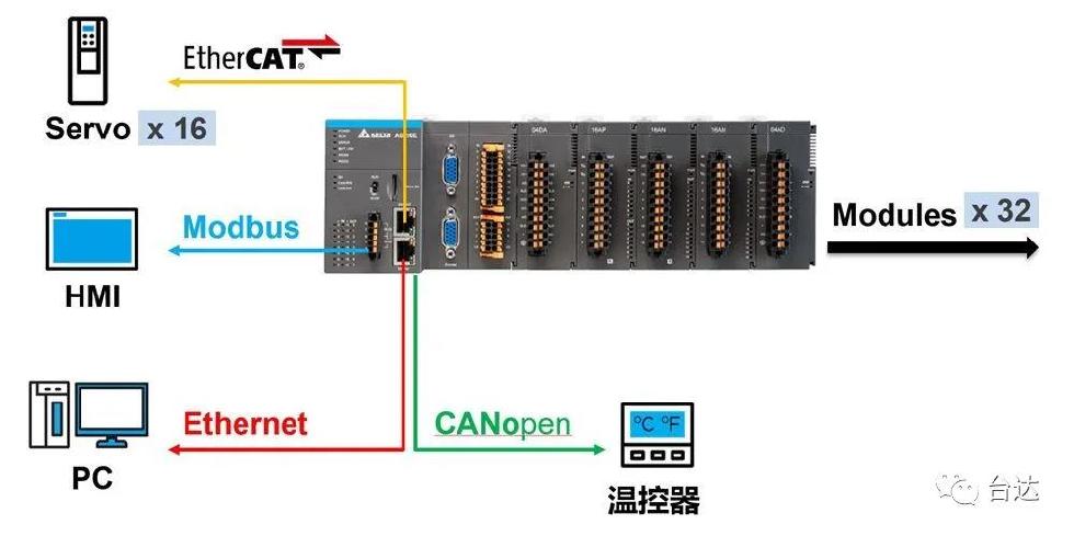 AS500系列的系统架构,通过以太网口或是串口可以和第三方设备、人机或是上位机进行数据交换,通过自带的CAN口可以和支持CAN协议的设备进行交互,让数据更新更快更稳定。此外,借助于主机右侧可拓展的32块AS模块,AS500系列最多可以支持不超过1024个I/O点数。