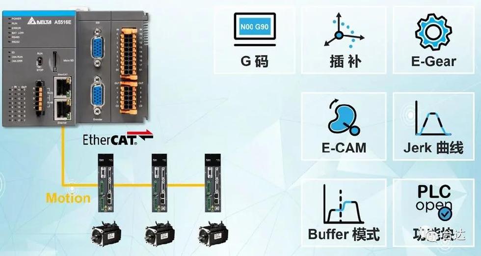 AS516的运动功能同样强大,支持速度、位置、扭矩、原点回归等相关控制功能,支持电子凸轮、电子齿轮、旋切等多轴功能,支持G代码及坐标指令,支持PLCopen2.0的功能块。这些全面的功能,也使得AS500在中高阶的包装设备、机床、电子电工等应用场景中,均可大展身手。