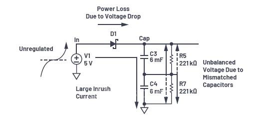 图1.过度简单的设计导致超级电容充电方案存在风险的示例