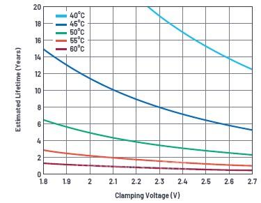 图2.使用寿命与嵌位电压的关系图(以温度作为关键参数)