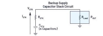 关于设计中的可用电能有一些提示说明。由于堆叠式超级电容的ESR固定不变,所以在备份操作期间唯一变化的值就是堆栈电压,当然也包括堆栈电流。