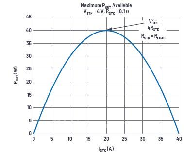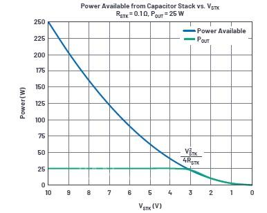 图5显示可用功率与VSTK的函数关系图,假设最优电阻与负载匹配,备用功率为25 W。此图也可以视为无单位时基:当超级电容满足所需的25 W备份功率时,超级电容向负载放电,堆栈电压随之降低。在3 V时,存在一个拐点,此时负载电流高于最优水平,导致负载的可用备用功率降低。这是系统的最大输出功率点,就在这个点,超级电容的ESR损失增加。在这个示例中,3 V明显高于DC-DC转换器的压差,所以不可用电能完全由超级电容引起,导致调节器未得到充分利用。理想情况下,超级电容达到压差,使得系统供电能力达到最高。