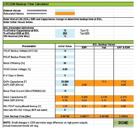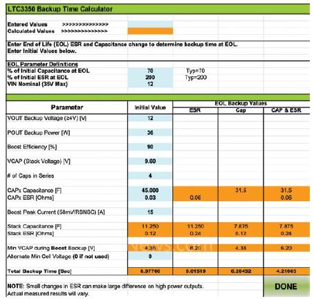 对于必须达到一定使用寿命的系统,使用前面所述方法并考虑EOL值时必须进行相应更改,一般采用70% CNOM、200% ESRNOM。这使计算变得复杂,但是大部分ADI超级电容管理器都可以使用产品页面上现有的电子表格工具进行计算。
