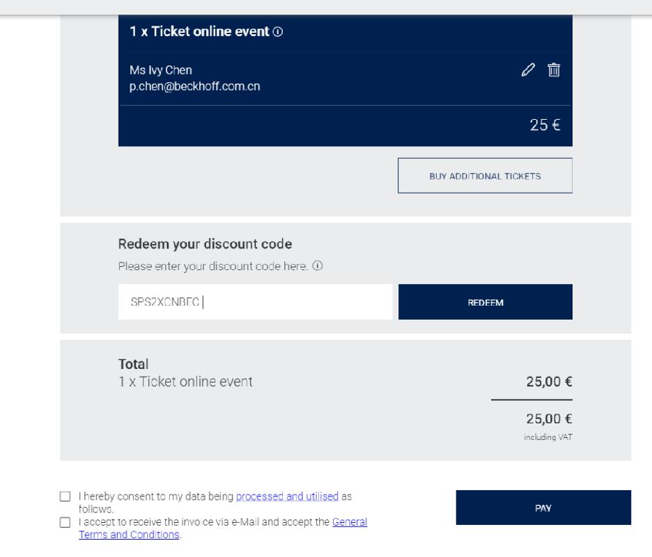 STEP 2 在购买门票时,使用倍福提供的折扣券码。