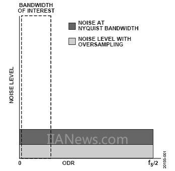 在模数转换期间,模拟信号由ADC数字化。与非过采样解决方案相比,过采样通过对模拟信号进行采样,并以远高于所需速率的方式对该信号进行数字转换来提高数字化信号的有效分辨率。过采样允许用户在更宽的带宽内对转换器噪声进行平均,从而消除噪声。对于不相关、宽带(白)和零(0)均值的噪声,当平均和/或滤波到特定带宽时,每2倍过采样,噪声就会降低√2倍或3 dB。其他频谱内容(例如相关噪声或谐波)不会因平均而降低。图1显示了一个ADC的噪声水平(深灰色),噪声来源有多个,包括量化噪声、热噪声和外部噪声(例如驱动器、时钟和基准电压源),分布在奈奎斯特带宽上。