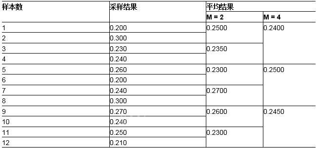 类似地,应用平均系数M = 4时,对第一组四个样本进行平均,然后对下一组四个样本(样本5至样本8)进行平均。简化的正常平均公式为: