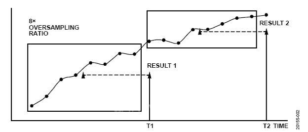 在正常平均过采样中,平均算法实现为简单平均:将M个样本加在一起,然后将所得的和除以M。在这种方法中,对每个平均结果都会采集一个新的M样本集。